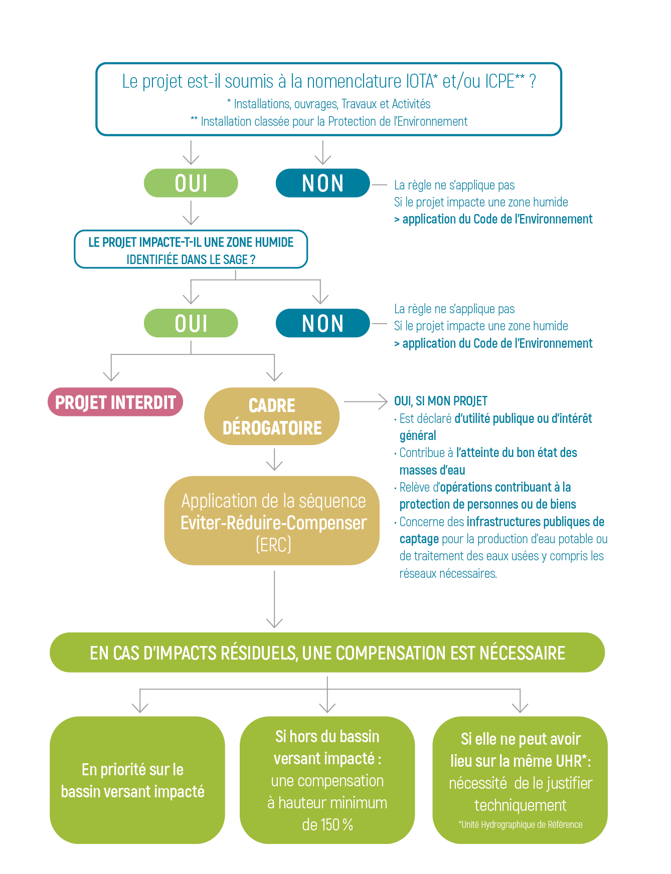L’objectif de cette règle repose sur l’interdiction de certains projets (IOTA* et ICPE*) qui pourraient mettre en péril des zones humides identifiées dans le cadre du SAGE.